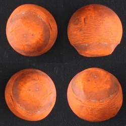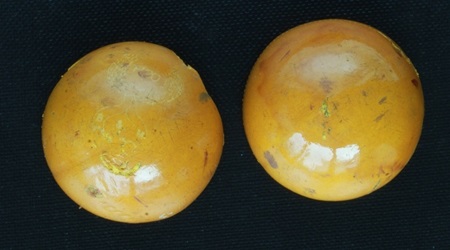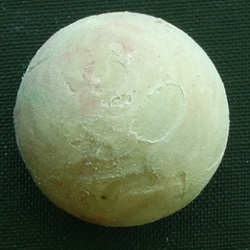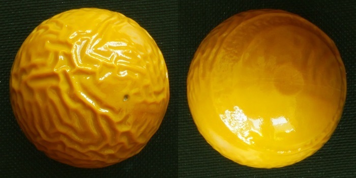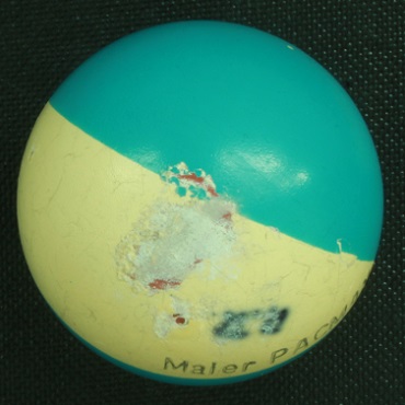 Recht interessant ist das Verhalten einiger Lacke, die erst nach einigen Jahren mit irgendetwas reagieren. Das führt dazu, das Bälle miteinander verkleben, wobei sich die zwei oder auch mehr Lacke zu weichen Masse "verschmelzen". Recht auffällig ist das bei alten, zwei- oder mehrfarbigen MG Bällen. Das die Lacke im allgemeinen sich verändern dürfte man als normal ansehen, das dadurch der eine oder andere Ball unbrauchbar wird ist ein Ärgernis, andererseits gibt es vermutlich kein künstliches Produkt das mehr als 50 Jahre unverändert bleibt. Als Beispiel nachfolgend ein Wagner 29, dessen Lack extrem ausgehärtet ist, wobei die Liegeplatten der oberen Kategorie, der falschen Lagerung, zuzuschreiben sind.