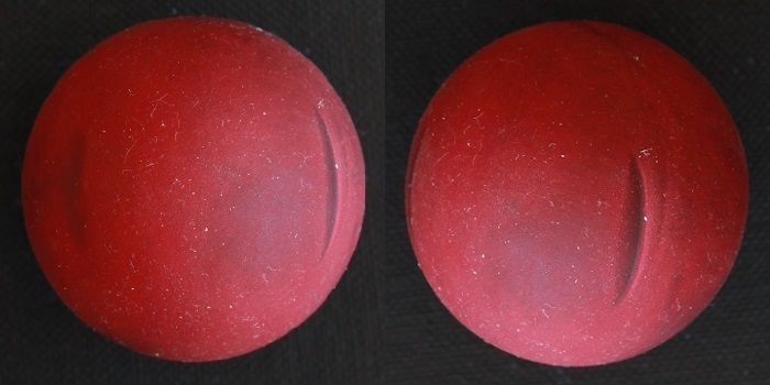 1.) Deutschmann Super 11, mit zwei nahezu gegenüberliegenden "Liegeplatten". Auf dem zweiten und dritten Bild sind diese eingekreist. Ergebnis dieser Druckstellen sind 3,3mm Differenz zischen den Maximalwerten im Durchmesser. Vermutlich wurde der Ball über längere Zeit beidseitig eingeklemmt.